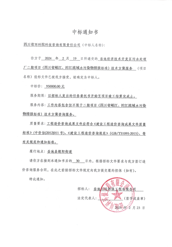 岳池經濟技術開發區污水處理廠二期項目(四川省岷江、沱江流域水污染物排放標準)技術方案服務—中標通知書