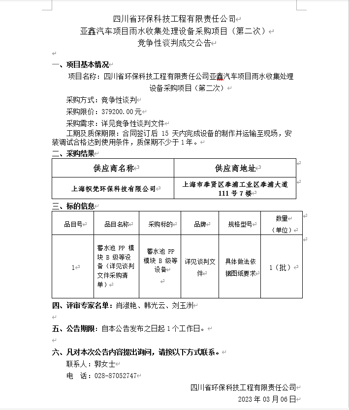 亞鑫汽車項(xiàng)目雨水收集處理設(shè)備采購項(xiàng)目成交公告